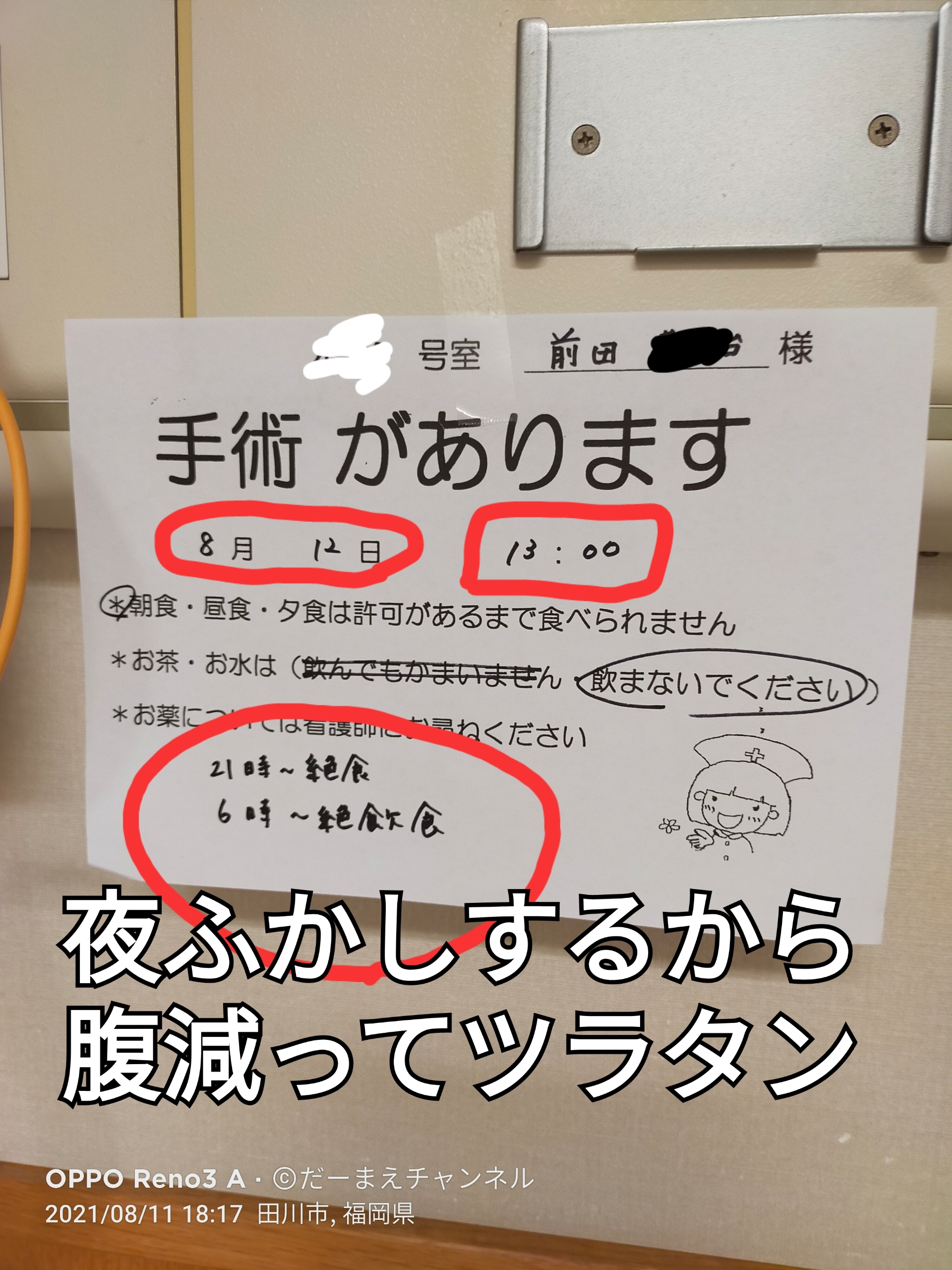 ところで21時からの絶食は、さほど苦にならないのですが、朝6時以降の 水すら飲めない のは辛いです、これ書いているのは、手術日(8/12)の朝6時過ぎ
