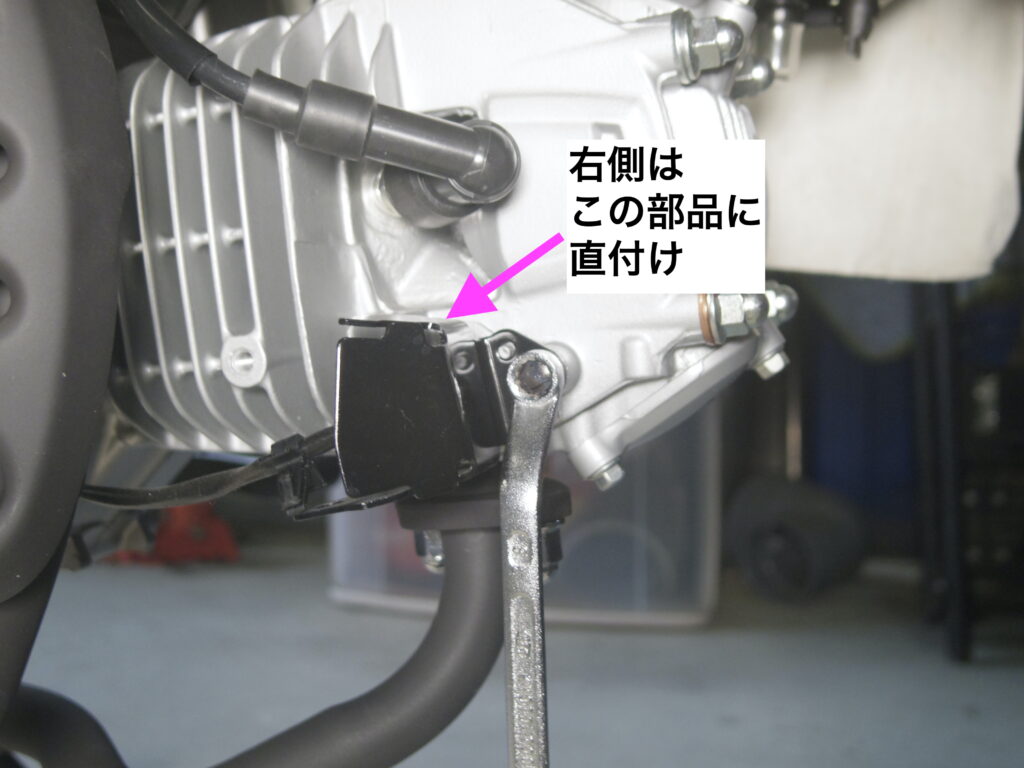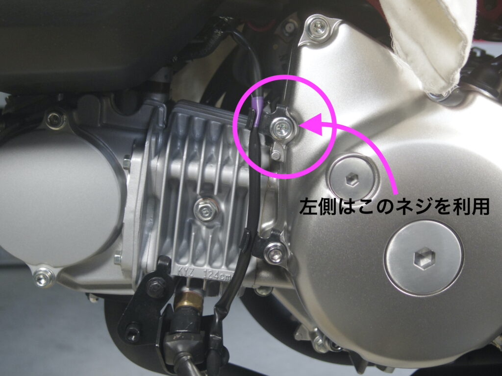 左側は、クランクケースカバーのとめネジを利用して、付属のステーで固定しようと、