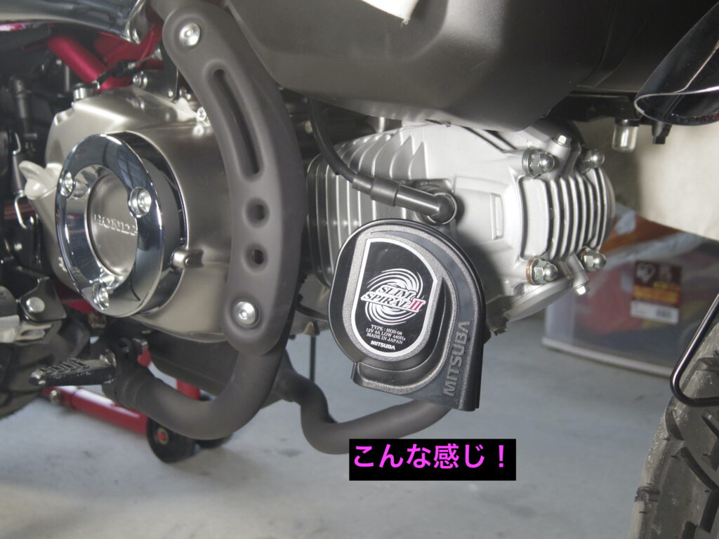 この後、武川製の(スクランブラーマフラー)に交換したら、ホーンの配線差込部とのクリアランスが神がかってギリだったので、ホーンの角度を多少変更しました。