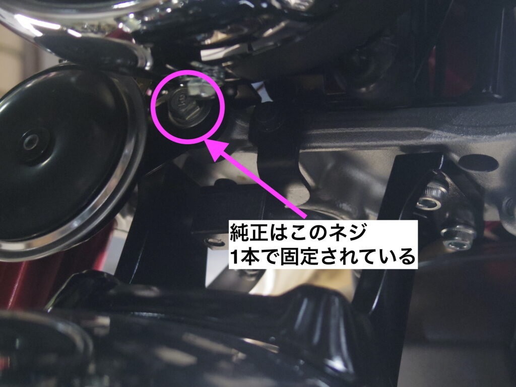 純正ホーンの特徴(取り付け)は、アンダーブラケットにボルト1本(10mm位)で止まっており、配線は、平ギボシタイプで2本配線されています(専用カプラとかではない)。