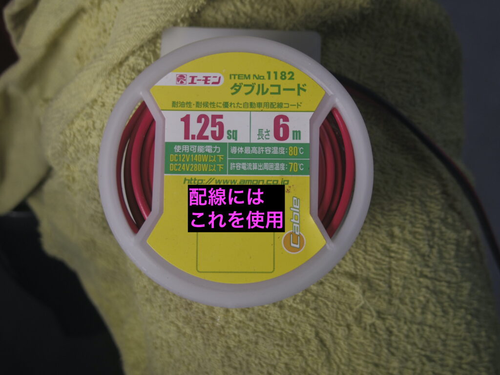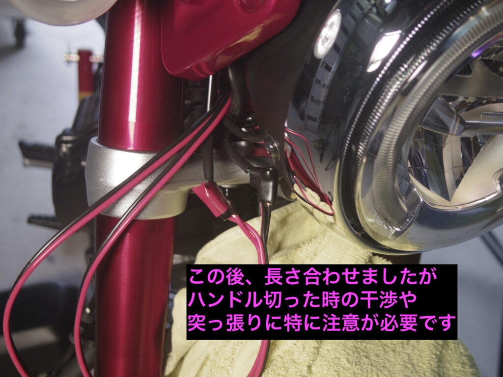 新しいホーンには、+ーの極性はないらしいが、一応テスターで 車体からの配線の+ーを確認し、+に赤テープで印をつけました。