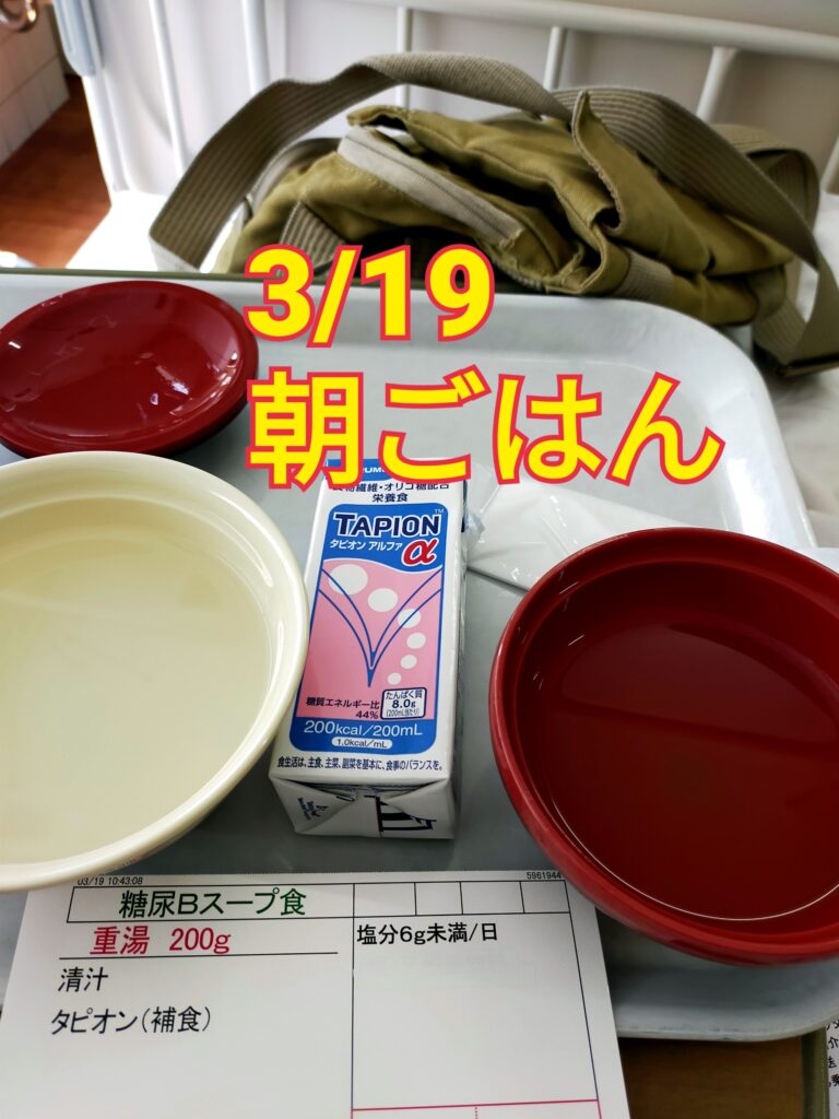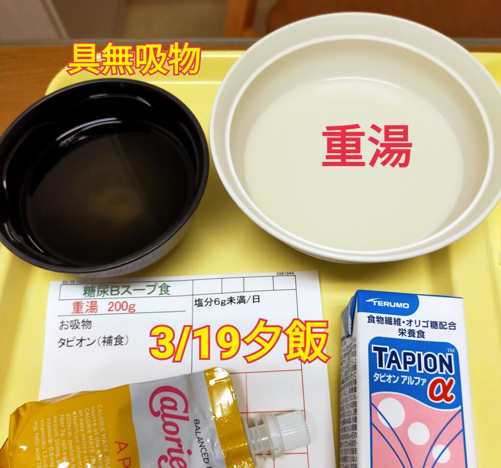 で、12時になったのでお食事タイム、メニューは、・重湯・清汁・タピオン(栄養ジュースみたいな)とデザートでカロリーメイトのりんごゼリー。すべてが旨かった(清汁に至っては味濃いかった)