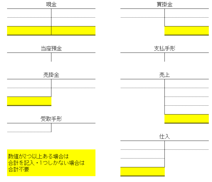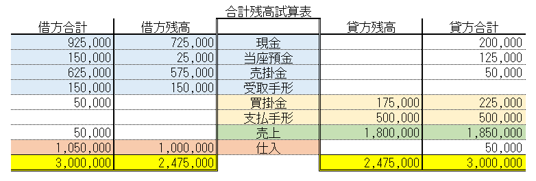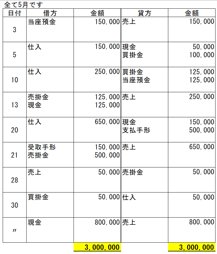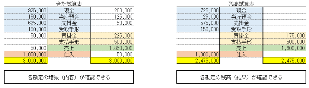 ※あくまで金額の右左のチェックであり科目誤り:例えば「現金¥5万」を「当座預金¥5万」と誤って転記しても合計は変わらないため ある程度のチェック としています。