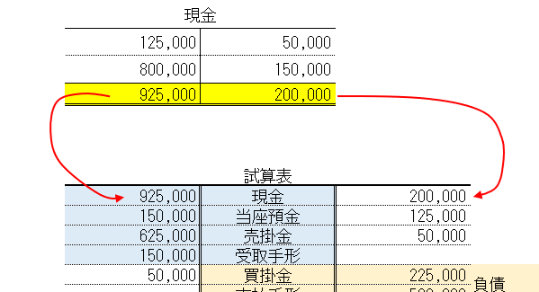 ※「現金」を例にとると ←借方合計¥925,000 ・貸方合計→¥200,000で