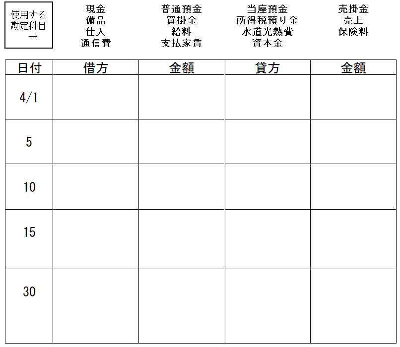 下記の取引を①仕訳を行い→②各勘定へ転記し(金額のみでよい)→合計残高試算表を完成させてください。