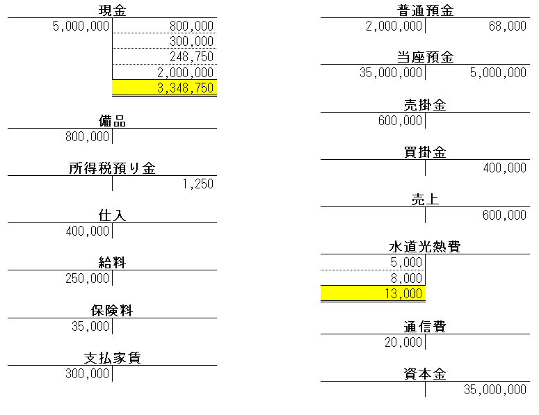 そしてこの仕訳からすべての勘定科目を各総勘定元帳へ転記したものがこちらです。
