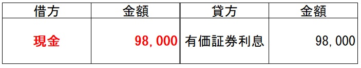 例② 手持ちの社債につき利払い日が到来した。なお、利息額は¥98,000である。