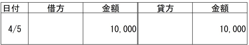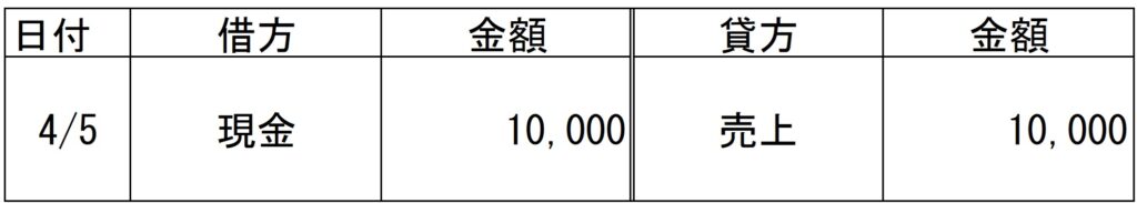| ・本日(4/5)お客様へ、¥10,000の商品を販売し、代金として、現金¥10,000を受け取った |