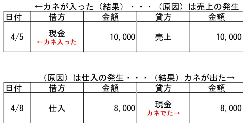 4/5の取引と4/8の取引では「現金」の位置が 借方←左・貸方→右で逆位置ですね!