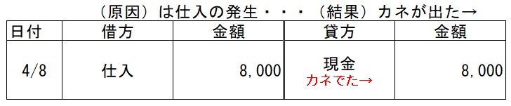 | 1:日付 4/10 の出来事 2:金額 代金¥8,000 の話 3:原因と結果 商品を仕入れ お金を払った |