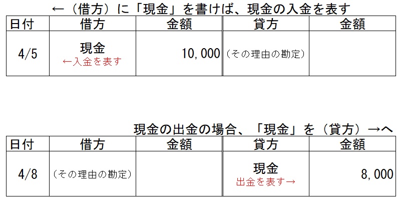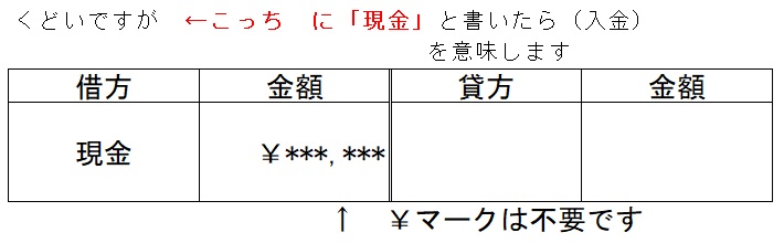 難しく書くと(現金は、資産であり、資産は借方に位置するため、増加の場合は、借方へ記載し、減少した場合は、貸方へ記載する。)