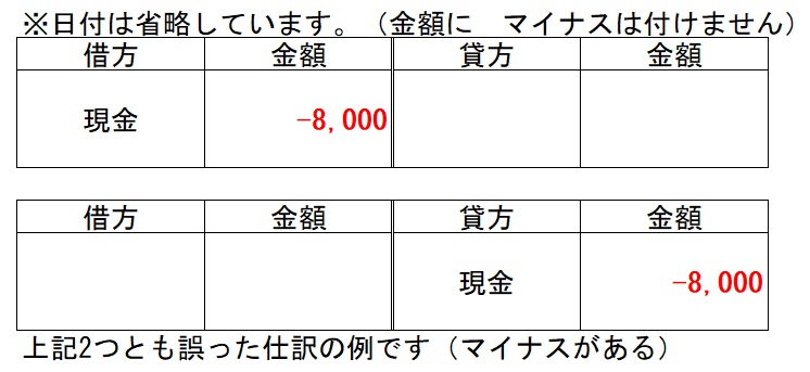 上の2つの仕訳は 金額に マイナス(-)を付けていますね。これは誤りです。