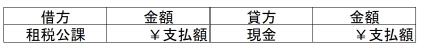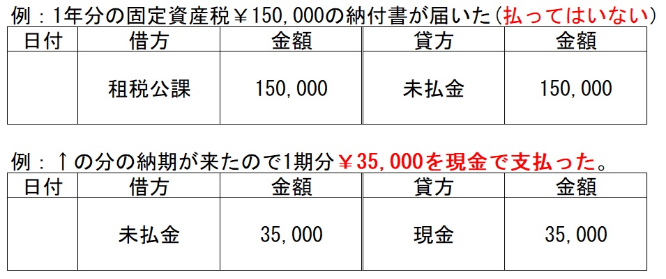 ・下記 例 のように納付書を受け取ったら その日で全額(1年分)を 「租税公課」と「未払金」とし納付ごとに「未払金」の支払いとする方法もあります。問によっては「未払税金」とする。