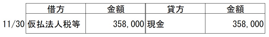 11/30:中間申告と中間納付を行い、法人税の中間納付額として¥358,000を現金にて納付した。