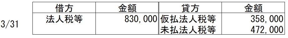3/31 当期決算において「法人税等」¥830,000 が計上されたので中間納付済みの「仮払法人税等」と相殺し、残額を「未払法人税等」とした。