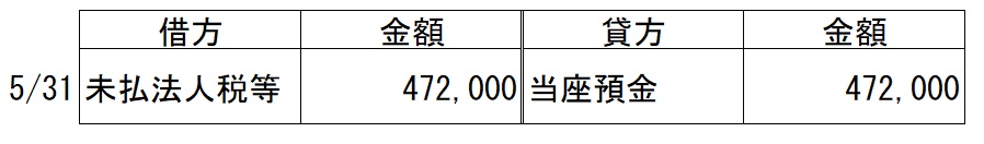 5/31 本日、確定申告を行い、併せて法人税等を小切手を振り出して納付した。