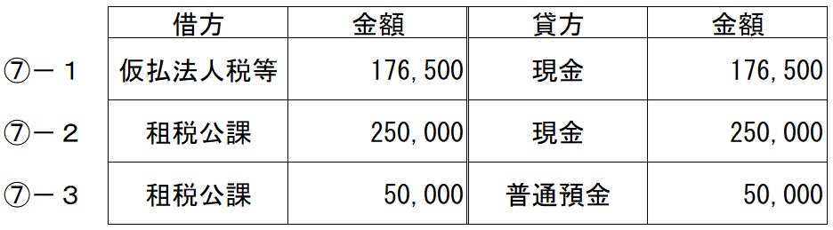 ⑦ー7:上記⑦-6の分の法人税等を小切手を振り出して納付した。