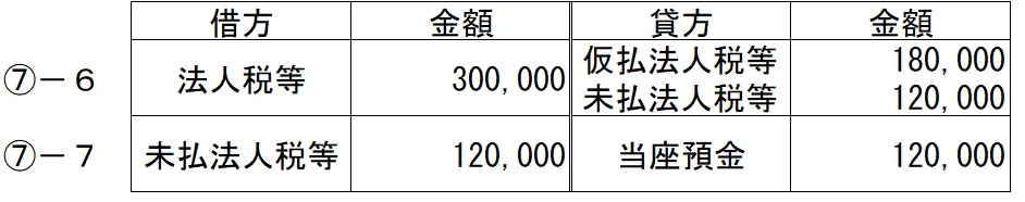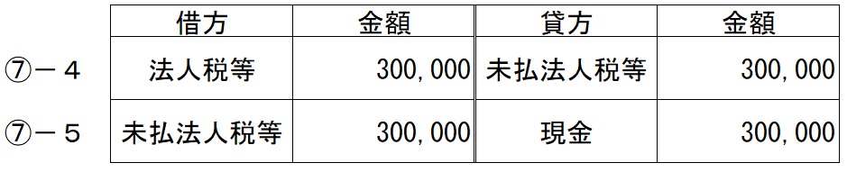 ⑦-4:決算を迎え、当期の法人税等は、¥300,000と計上された。なお、中間納付は行っていない。