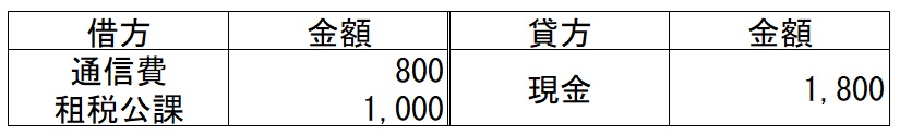問題:本日、郵便局にて 切手@¥80を10枚=¥800 と収入印紙@¥200を5枚=¥1,000 を購入し、現金で支払った。なお、全額費用計上するものとする。