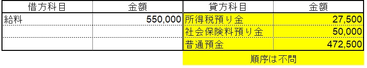1.給料¥550,000の支給にあたり 所得税の源泉徴収額¥27,500及び社会保険料の従業員負担分