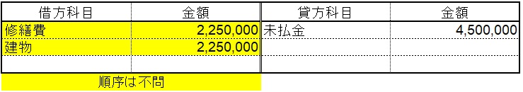 同じく問より(工事代金のうち半分は収益的支出):「修繕費」(¥450万の半分=¥225万)