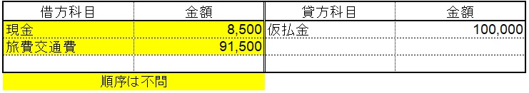 6.出張中の従業員が帰社し、出発前に旅費として概算払いしていた¥100,000(現金で支給済み)の精算を行い、おつりとして¥8,500を現金で受け取った。