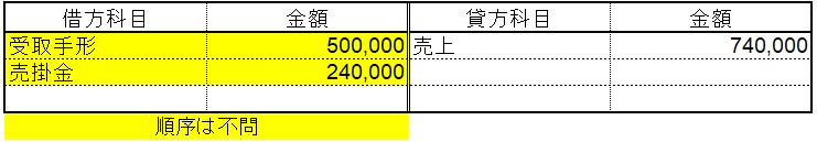 7.得意先へ商品(仕入原価:¥330,000)を¥740,000で売上げ、同店振出の約束手形¥240,000を受け取り残額は、翌月末に普通預金へ振り込んでもらうこととした。